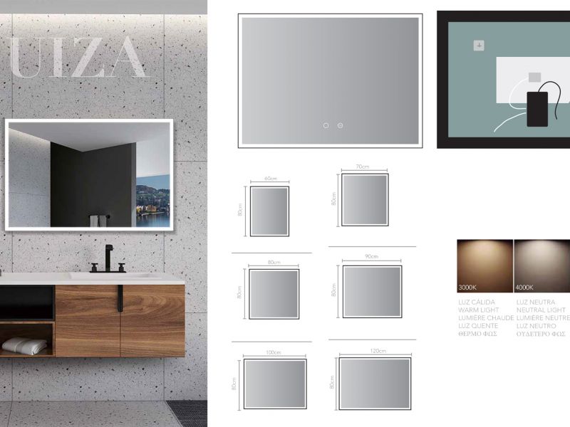 Carré ou rectangulaire selon le format que vous choisissez la collection de miroirs Suiza propose une gamme rétro éclairé dans 6 modèles avec possibilité de personnalisation du coloris parmi une gamme de noir, gold et rose gold. Avec une présence de deux capteurs donc un anti buée et le second de marche/arrêt. Ce miroir conviendra parfaitement avec tous les styles de salles de bains.