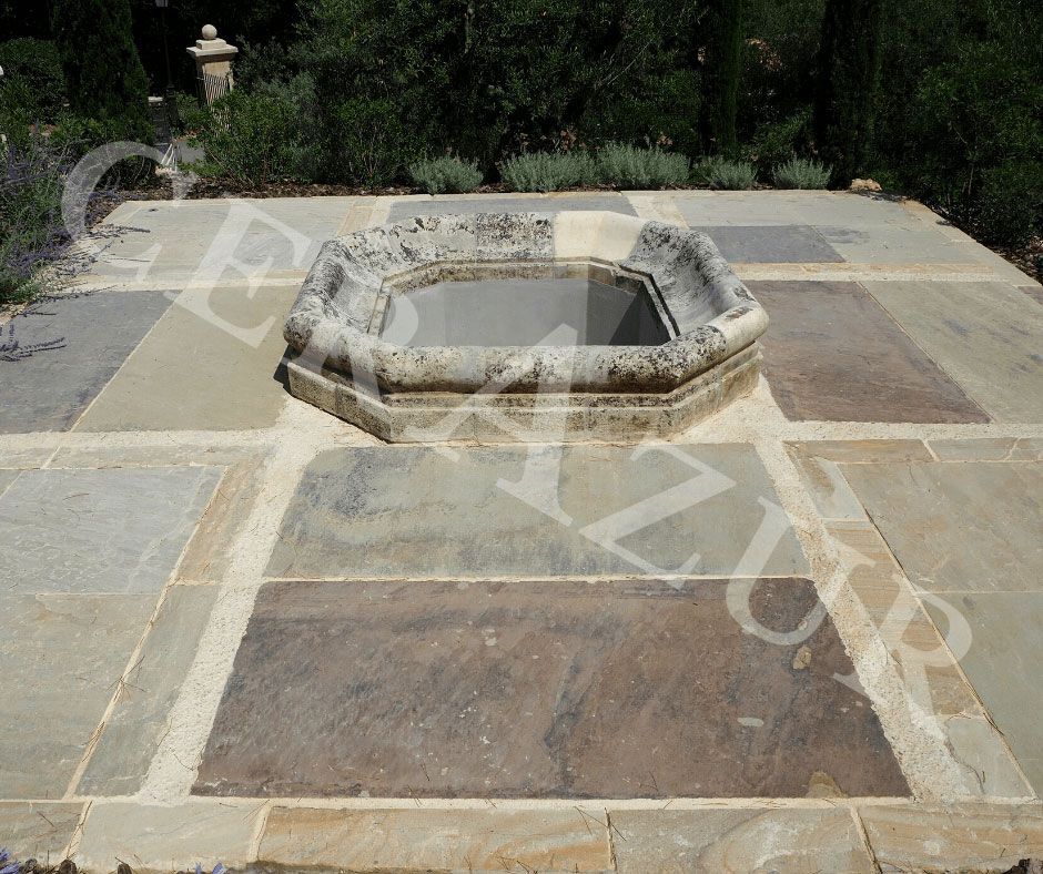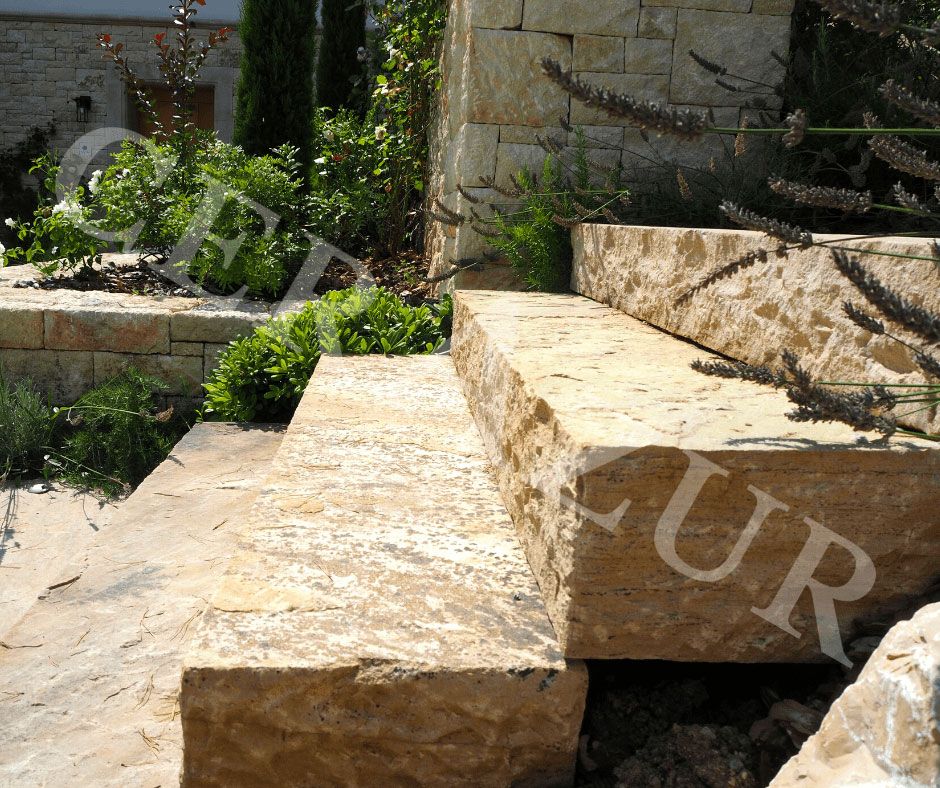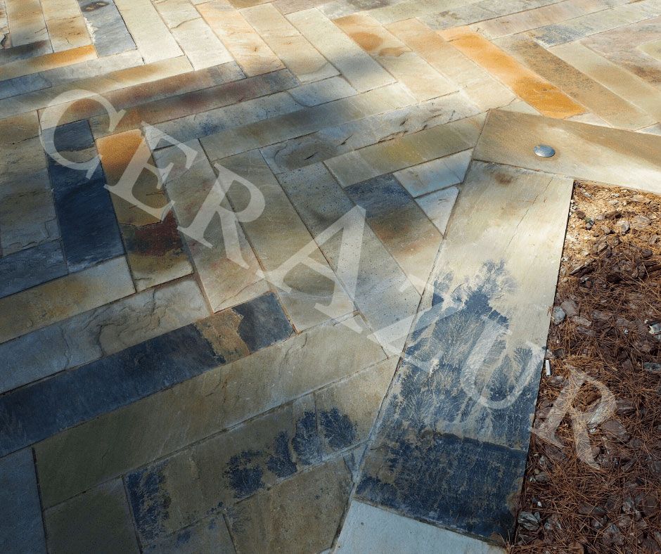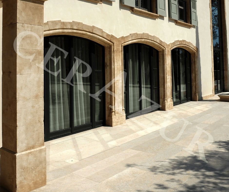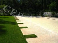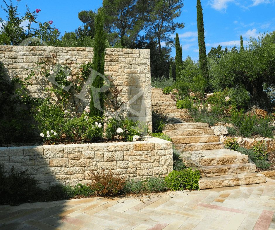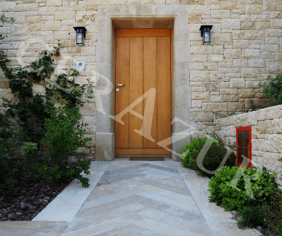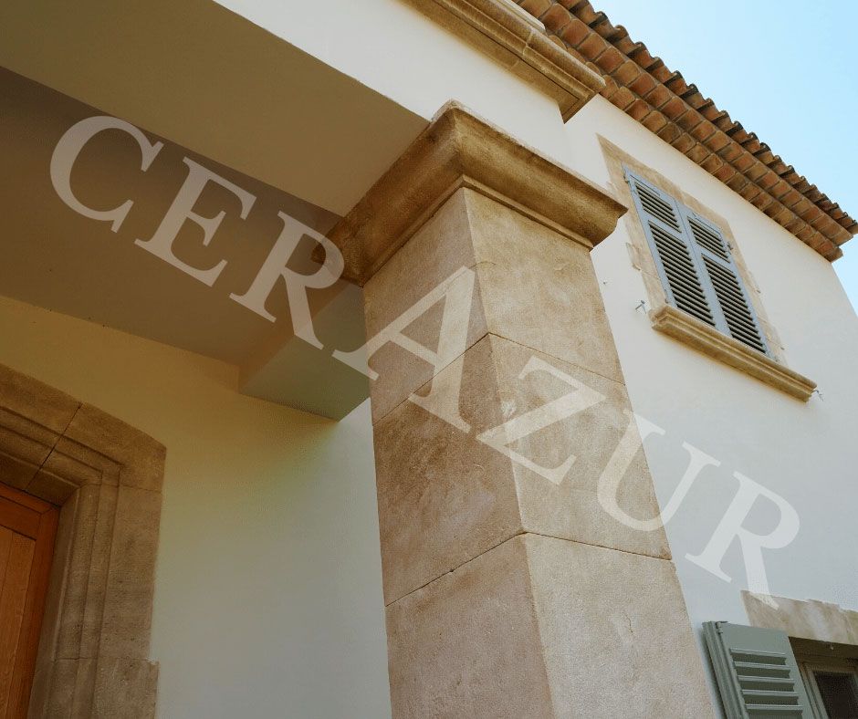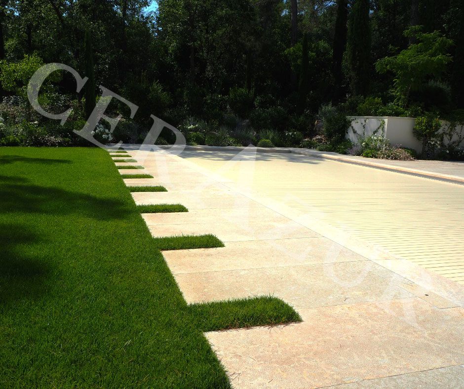Osez les mélanges de finitions au sein de vos projets d'aménagement ! Cerazur vous présente cette réalisation unique mettant en valeur la pierre naturelle par des jeux de finitions alternants surface bouchardée et brossée pour ainsi faire ressortir les textures et les teintes naturellement nuancées du Calcaire dense. En plus de cette pierre calcaire beige qui habille le tour de la piscine, le reste de la propriété met à l'honneur le Grès Indien qui représente une part importante de la création avec l'utilisation de grands formats réalisés sur mesure ou encore un pose en chevron au rendu incroyable !