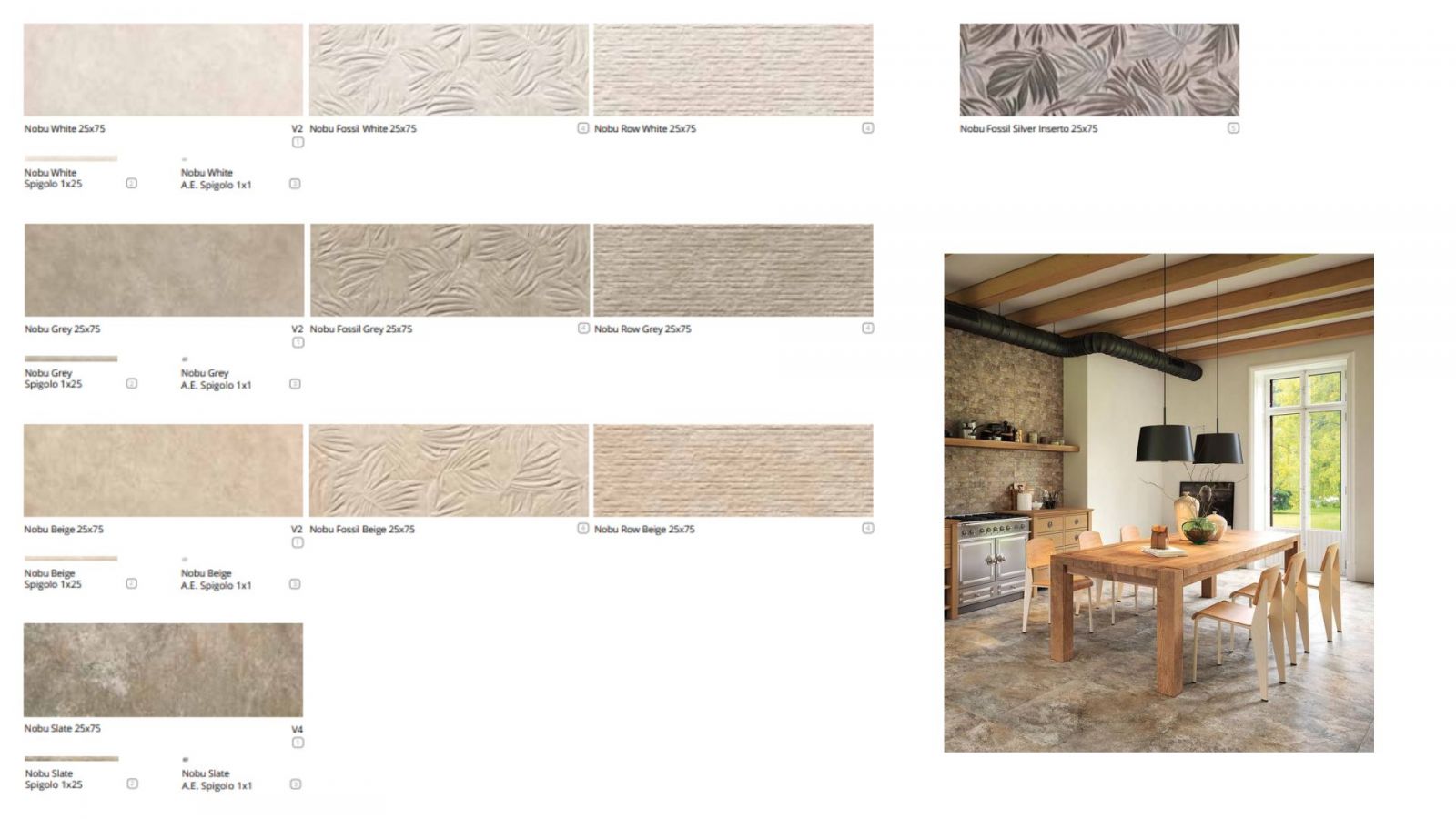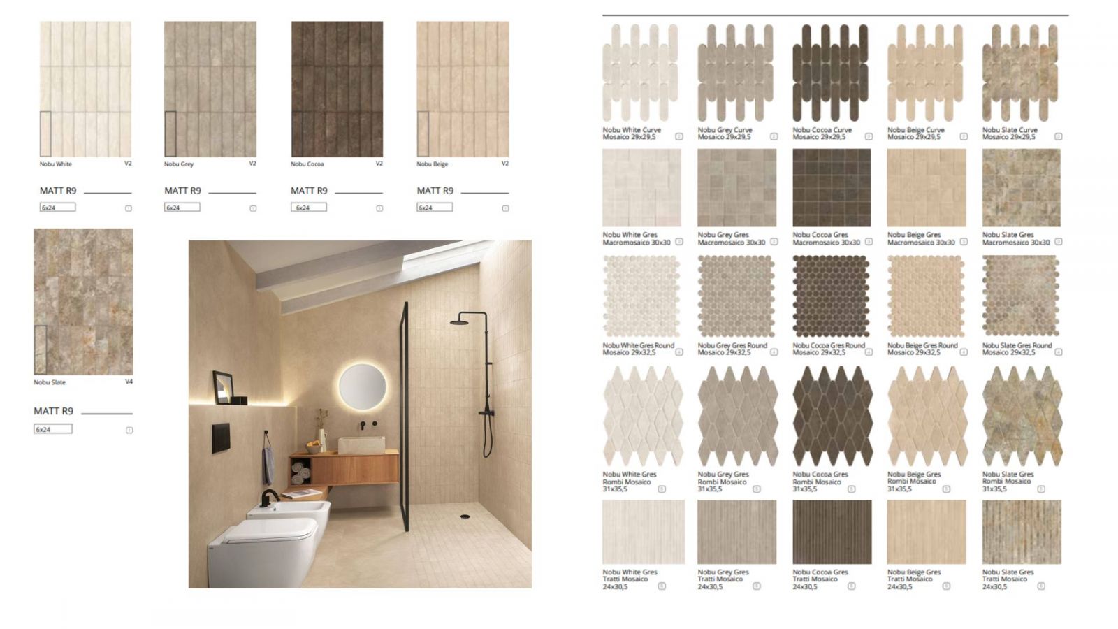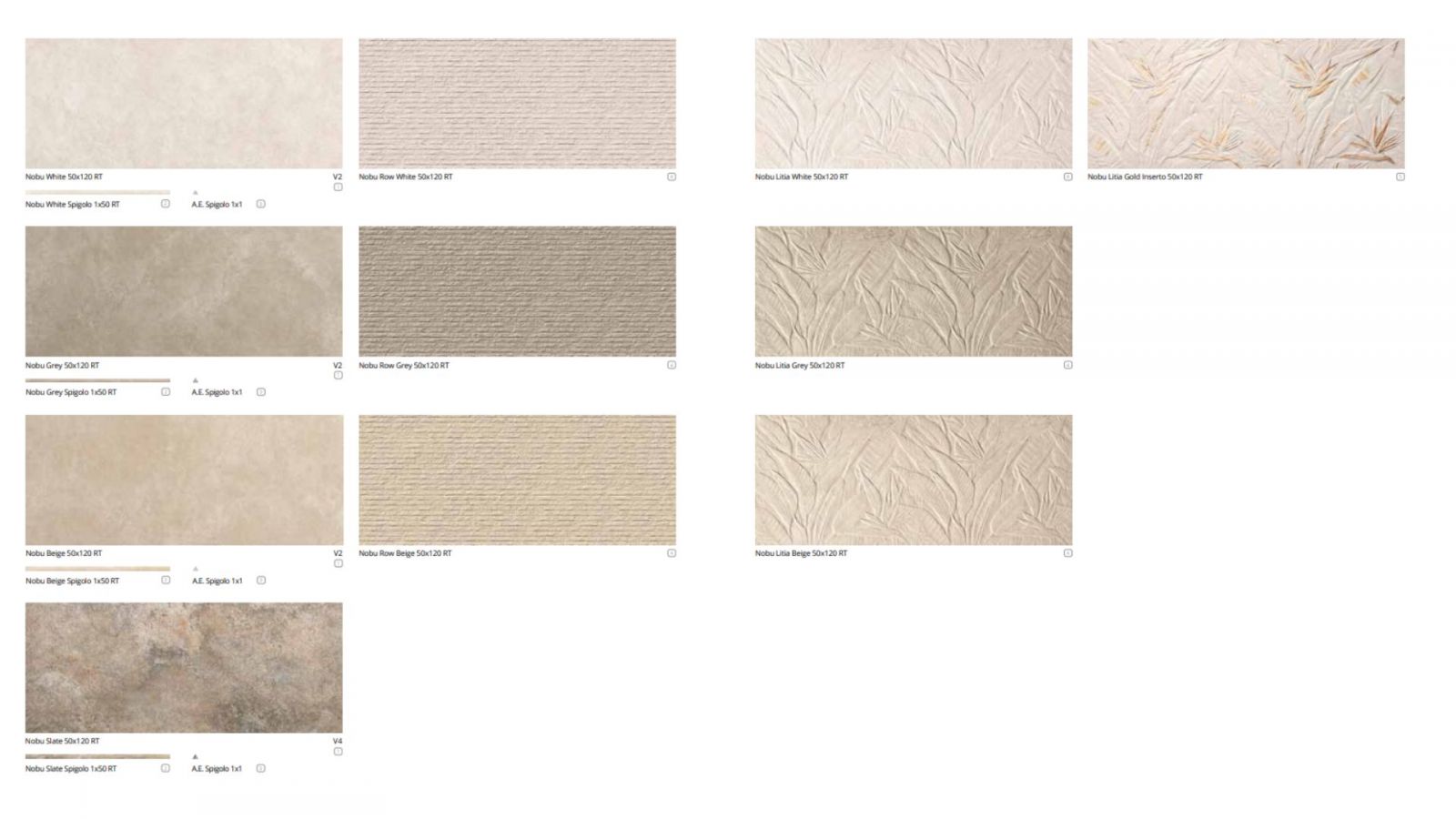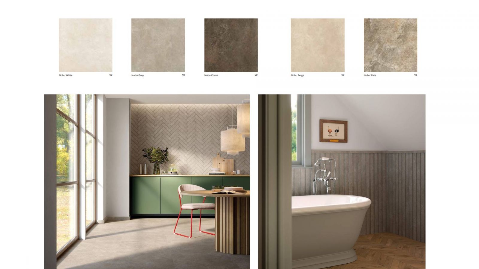 Les carreaux de la Série Nobu sont fabriqués en céramique de haute qualité, reproduisant fidèlement l'apparence et la texture de la pierre naturelle tout en garantissant robustesse et longévité. Les surfaces tactiles, légèrement ondulées, ajoutent une dimension sensorielle, et la gamme chromatique au charme moderne offre une profondeur surprenante.