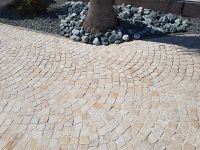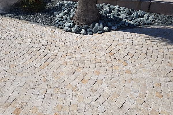 Une allée avec des pavés yellow antique et son style méditerranéen crée une ambiance chaleureuse avec des couleurs chaudes qui mettent en avant l'authenticité de la pierre.