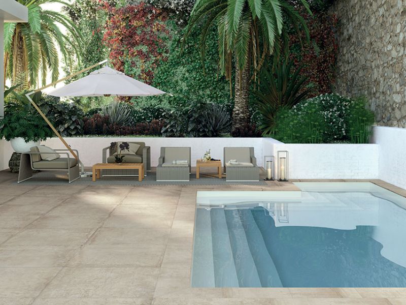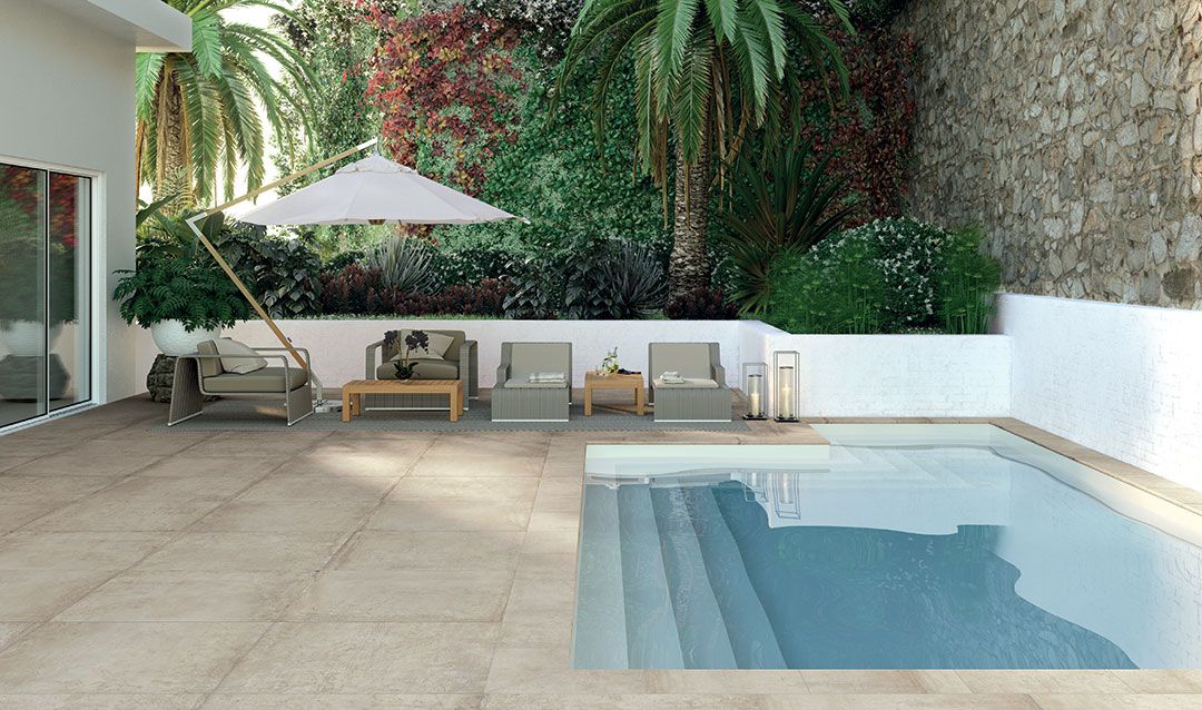 Pour un revêtement de sol extérieur la série Materika conviendra parfaitement à vos attentes avec son effet béton ciré.