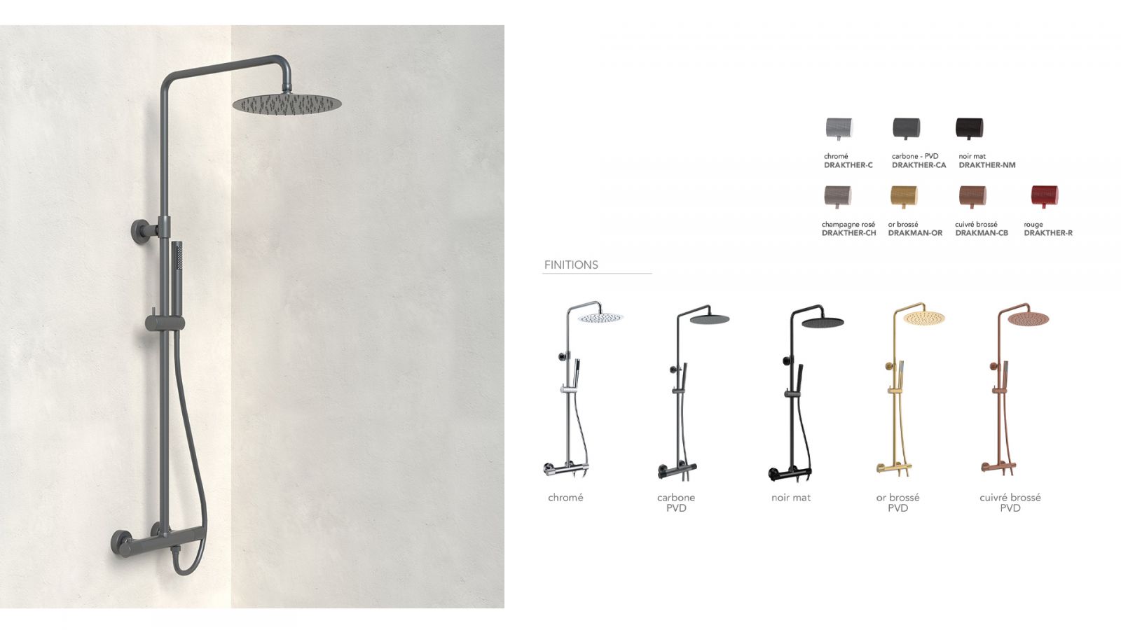La gamme de colonnes de douche Drakar est réglable jusqu'à une hauteur de 1325 cm, vous offrant un confort inégalé. Cette colonne de douche est équipée d'un mitigeur thermostatique et vous avez le choix entre trois finitions élégantes : chromé, noire ou carbone, pour personnaliser votre salle de bains selon vos préférences esthétiques.