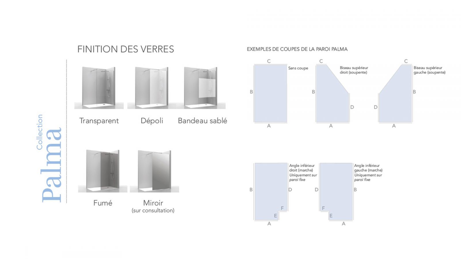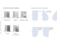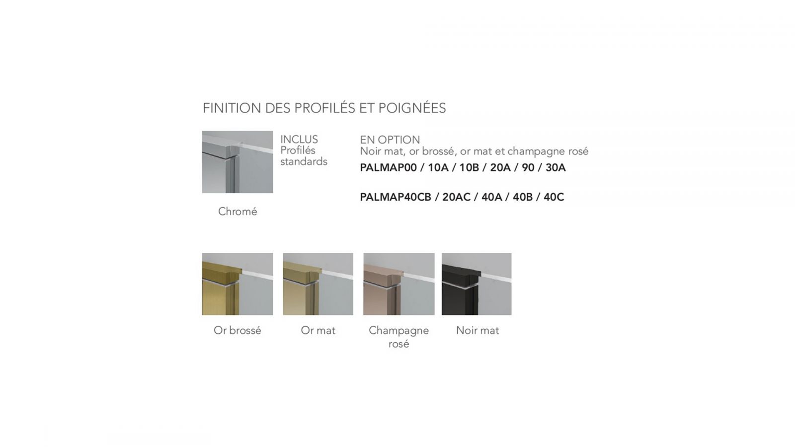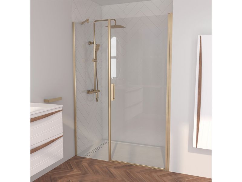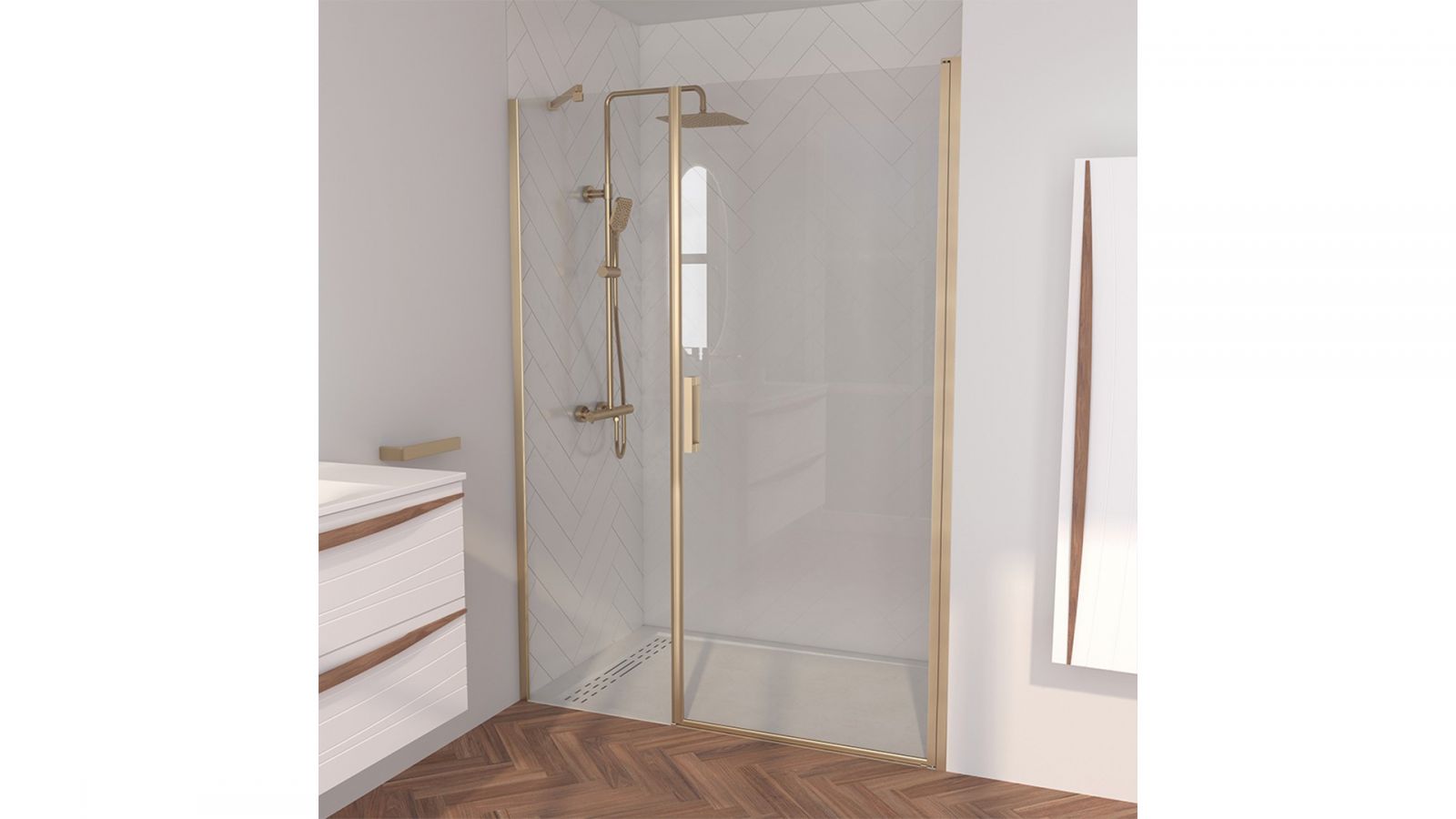 Une paroi de douche avec des portes battantes. Différents choix de finitions pour le verre ; transparent avec bandeau sablé, dépoli, miroir ou fumé. Un coloris doré qui lui confère un style raffiné.