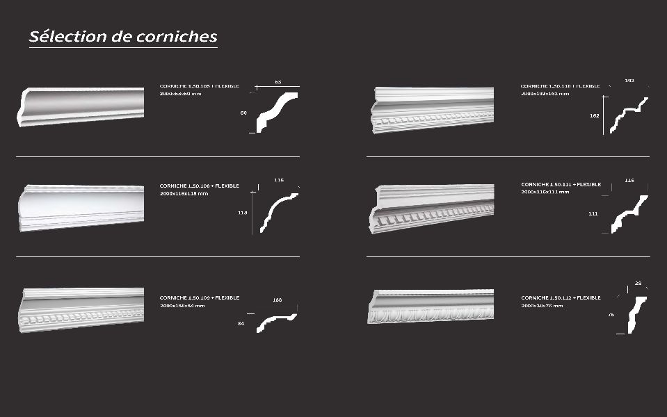 Vous avez la possibilité de les poser sur des murs de résidences privées comme ceux d'espaces publics et commerciaux. Les corniches avec l'option éclairage sont un réel atout, car en plus de vous apporter de belles finitions elles mettent en avant et en valeur vos pièces à vivre. Pour un effet chaleureux et tendance immédiat.