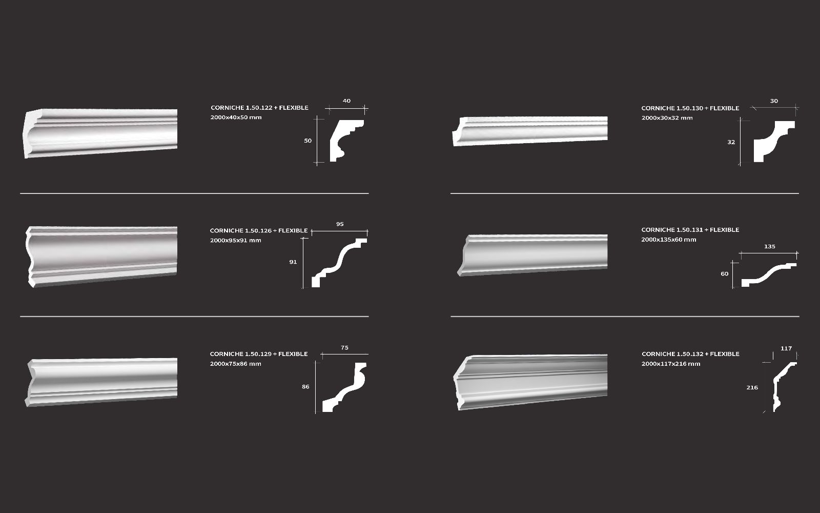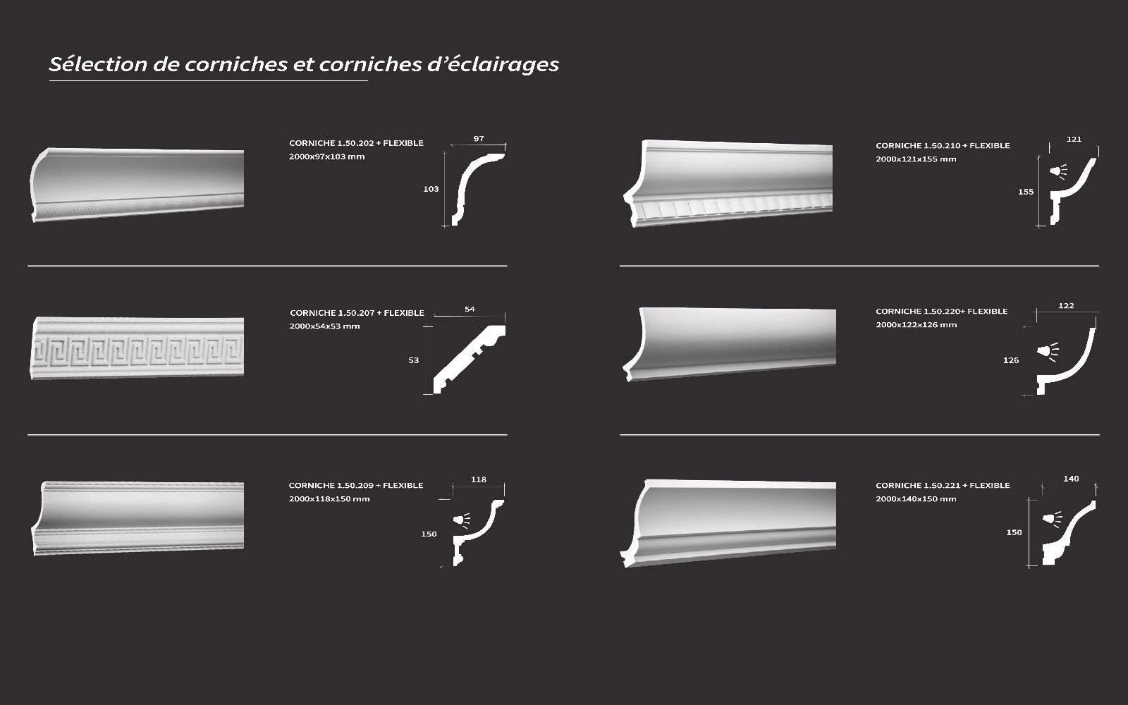 Avec une pose facile les corniches classiques et d'éclairage sont idéales comme finition de vos murs. Recommandées pour tous les types de pièces elles apportent à vos espaces un charme authentique est chic. Personnalisable grâce à une grande gamme de modèles ainsi que la possibilité de les colorer selon vos envies, elles s'accommoderont tout aussi bien dans des habitations modernes.
