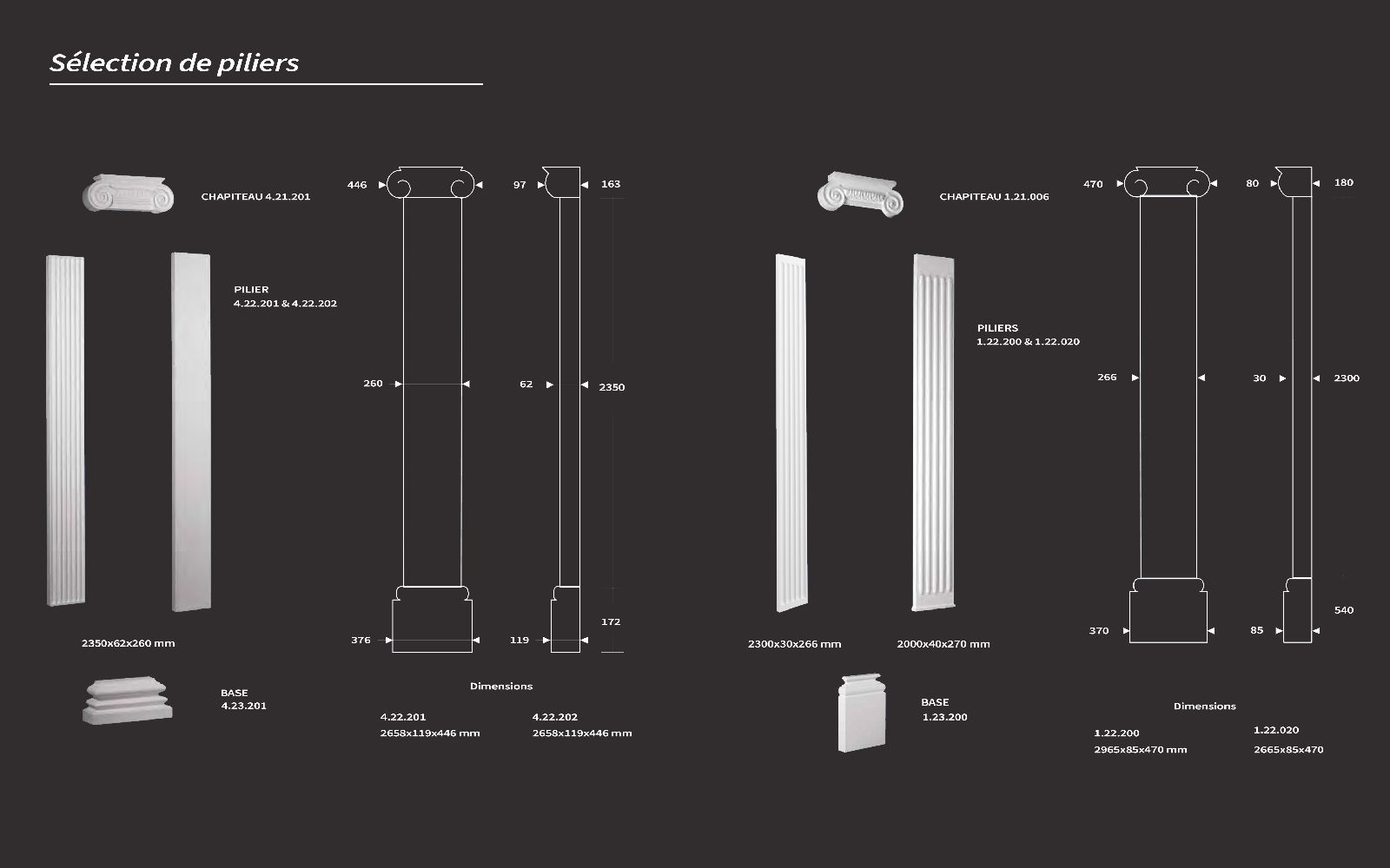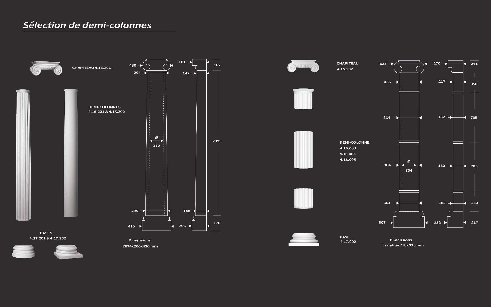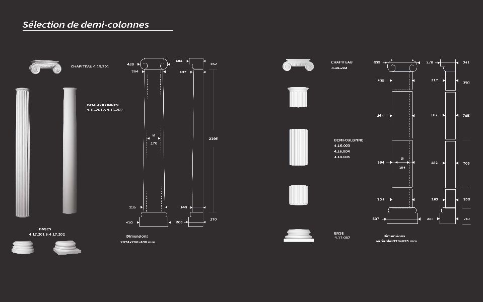Les piliers et les demi-colonnes sont des pièces décoratives qui permettent de créer des espaces à la fois chics et modernes. Ces éléments sont utilisés spécifiquement pour mettre en valeur des pièces comme un hall d'entrée, une à vivre ou bien comme objet de décoration seul ou incorporer à du mobilier. Les piliers et demi-colonnes apportent un charme authentique et classique à l'environnement dans lequel ils sont placés. Vous pouvez également en retrouver dans des matériaux différents comme ceux de la pierre naturelle. Les colonnes sont personnalisables et vous avez le choix de la composition selon le modèle et les dimensions pouvant s'assembler. Choix qui se résume à celui du chapiteau ou le haut de la colonne, puis celui du pilier et de la base.