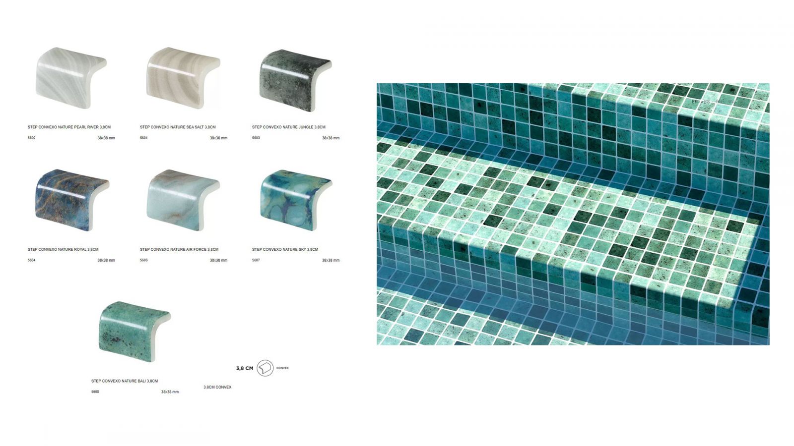 Les mosaïques pour marches de piscines de la série Steps apportent un esthétisme arrondi aux bordures et vous apportent plus de sécurité. Elles sont disponibles dans différentes finitions et coloris chez Cerazur.